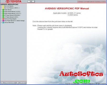 Мультимедийное руководство на английском языке по техническому обслуживанию и ремонту автомобилей Toyota Avensis Verso и Toyota Picnic 2001-2007 годов выпуска.