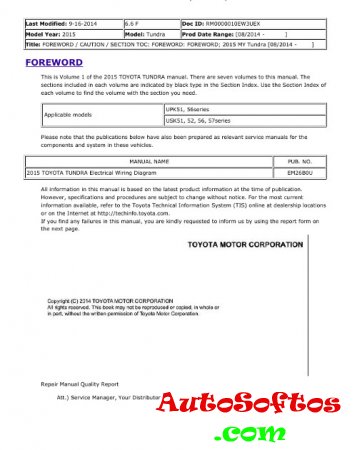 Руководство на английском языке по техническому обслуживанию и ремонту + схемы электрооборудования автомобиля Toyota Tundra с 2014 года выпуска.