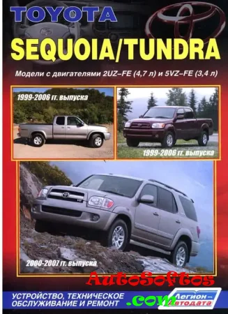 Руководство по ремонту Toyota Tundra / Toyota Sequoia, а также подробно изученное устройство моделей, пошаговое руководство по эксплуатации и операциям применяемым при техническом обслуживанием внедорожников Toyota Tundra / Toyota Sequoia. Выпуск модели Tundra осуществлялся с 1999 по 2006, Sequoia с 2000 по 2007 года. Автомобили оборудовались бензиновыми двигателями 2UZ-FE рабочим объемом 4,7 л. и 5VZ-FE объемом 3,4 л.