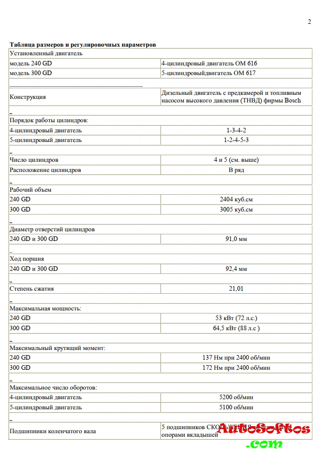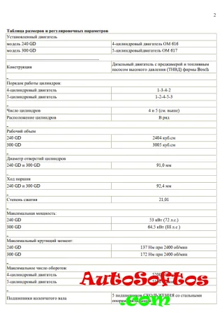 Содержит технические характеристики и параметры дизельных двигателей моделей 240 GD и 300 GD, включая размеры, моменты затяжки, порядок работы цилиндров и системы охлаждения и смазки. Также представлены данные по разборке и сборке двигателя, а также параметры для различных компонентов, таких как головка блока цилиндров, поршни и шатуны. Включены таблицы с допусками и границами износа для различных деталей двигателя.