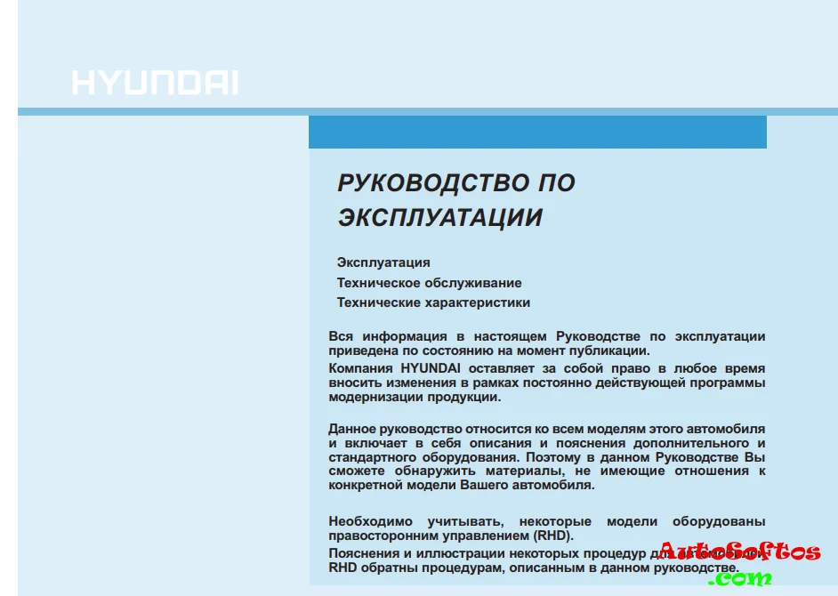 Руководство по эксплуатации автомобилей HYUNDAI содержит информацию о техническом обслуживании, эксплуатации и характеристиках моделей. Оно предупреждает о необходимости соблюдения инструкций для обеспечения безопасности и предотвращения повреждений автомобиля, а также о запрете внесения изменений в конструкцию. В документе также указаны требования к топливу и рекомендации по его использованию для оптимальной работы двигателя. Подробнее