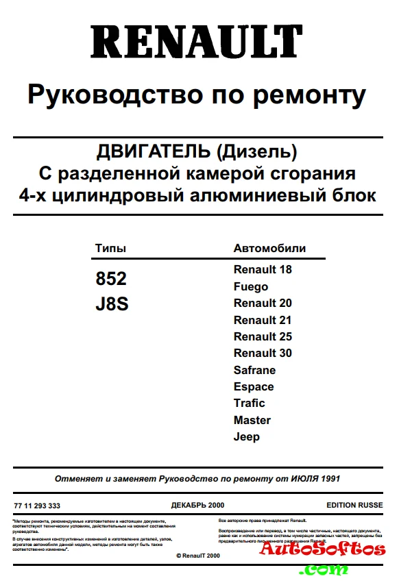 Renault Руководство по ремонту ДВИГАТЕЛЕЙ (Дизель) С разделенной камерой сгорания 4-х цилиндровый алюминиевый блок Типы 852 J8S. Автомобили Renault 18, Fuego, Renault 20, Renault 21, Renault 25, Renault 30, Safrane, Espace, Trafic, Master, Jeep.