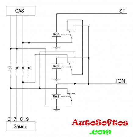 Что касаемо замка зажигания — от него до блока CAS идет шлейф из 14 проводов. Отделяем от него 1, 6, 7, 8 и 9 провод (1 красным цветом, лучше проверить по номерам в разъеме).