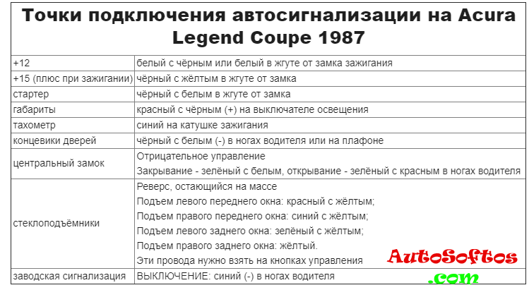Точки подключения автосигнализации на Acura Legend Coupe 1987