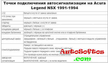 Точки подключения автосигнализации на Acura Legend NSX 1991-1994