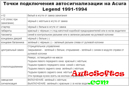 Точки подключения автосигнализации на Acura Legend 1991-1994