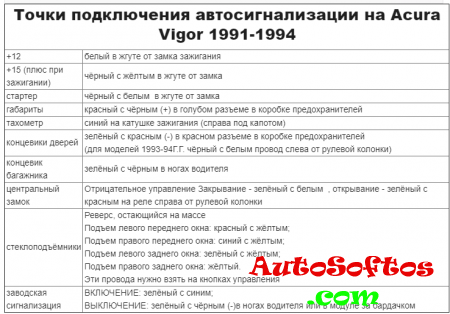Точки подключения автосигнализации на Acura Vigor 1991-1994.