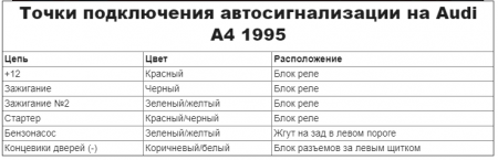 Точки подключения автосигнализации на Audi A4 1995