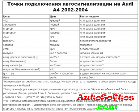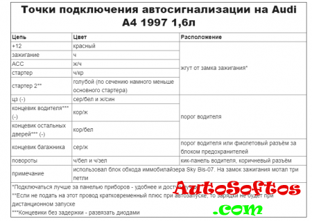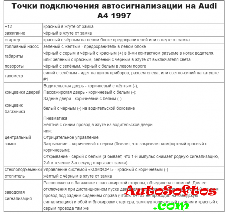 Точки подключения автосигнализации на Audi A4 quattro 2000 года со штатной системой сигнализации