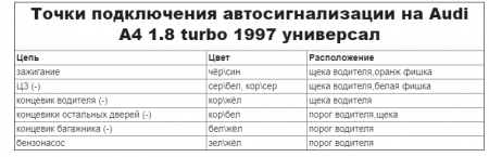 Точки подключения автосигнализации на Audi A4 1.8 turbo 1997 универсал