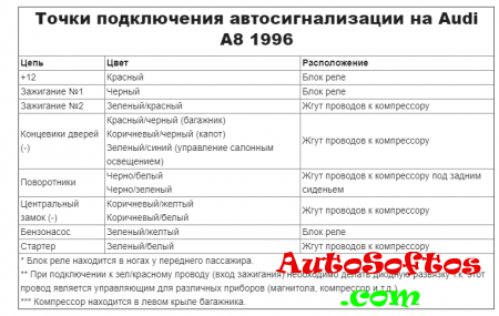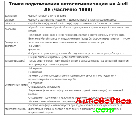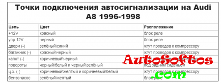 Точки подключения автосигнализации на Audi A8 1995 Точки подключения автосигнализации на Audi A8 1996 Точки подключения автосигнализации на Audi A8 1996-1998 Точки подключения автосигнализации на Audi A8 (частично 1999)