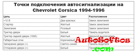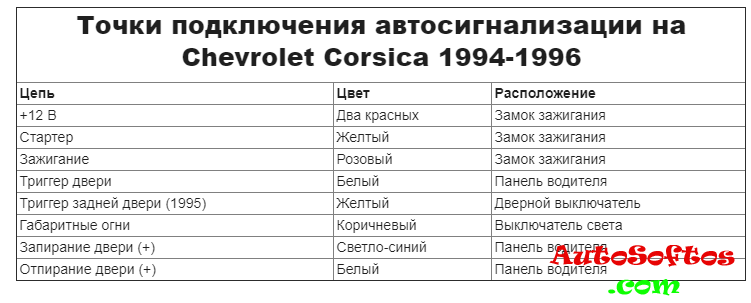 Точки подключения автосигнализации на Chevrolet Corsica 1994-1996.