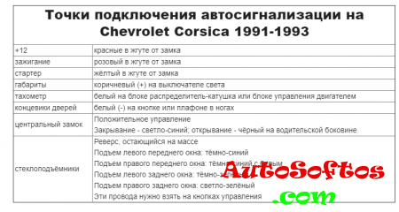 Точки подключения автосигнализации на Chevrolet Corsica 1991-1993.