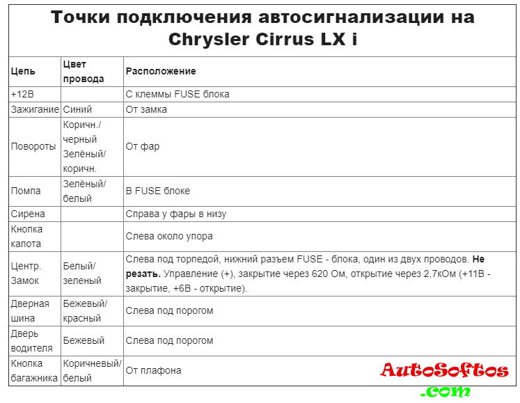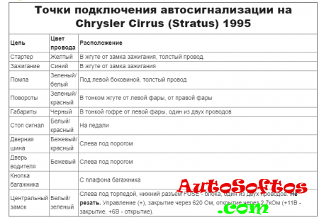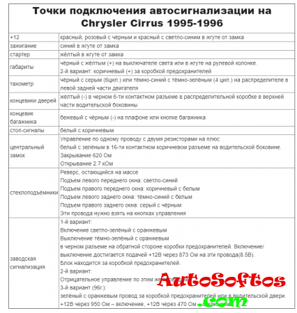 Точки подключения автосигнализации на Chrysler Cirrus 1995-1996