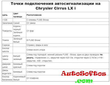 Точки подключения автосигнализации на Chrysler Cirrus LX i