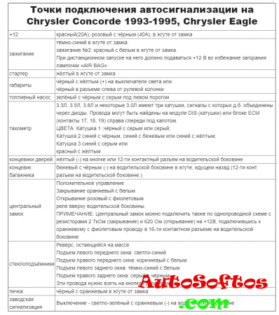 Точки подключения автосигнализации на Chrysler Concorde 1993-1995, Chrysler Eagle Точки подключения автосигнализации на Crysler Concorde Eagle Vision 1993-1996