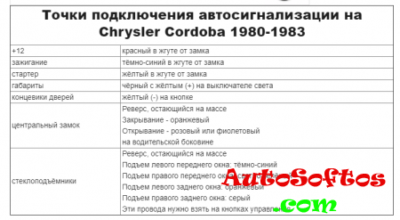 Точки подключения автосигнализации на Chrysler Cordoba 1980-1983.