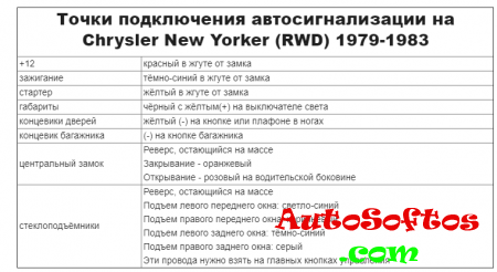 Точки подключения автосигнализации на Chrysler New Yorker (RWD) 1979-1983