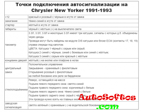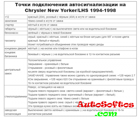 Точки подключения автосигнализации на Chrysler New Yorker/LHS 1994-1998