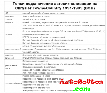 Точки подключения автосигнализации на Chrysler Town&Country 1991-1995 (ВЭН)