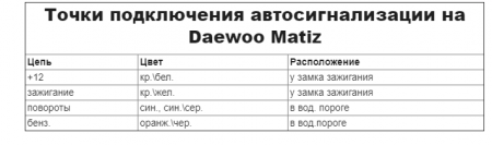 Точки подключения автосигнализации на Daewoo Matiz