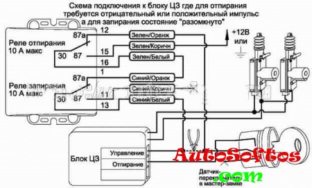 Центральный замок – в двери водителя коричневый провод от замка до блока кнопок. В двери разъем под проводку, просверлить отверстие. По схеме, как на рисунке ниже: отпирание на «–», запирание на разрыв. Управляет всеми дверьми.