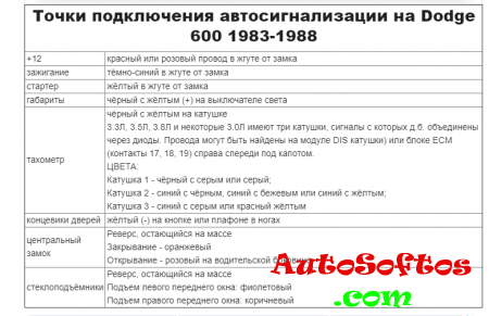 Точки подключения автосигнализации на Dodge 600 1983-1988