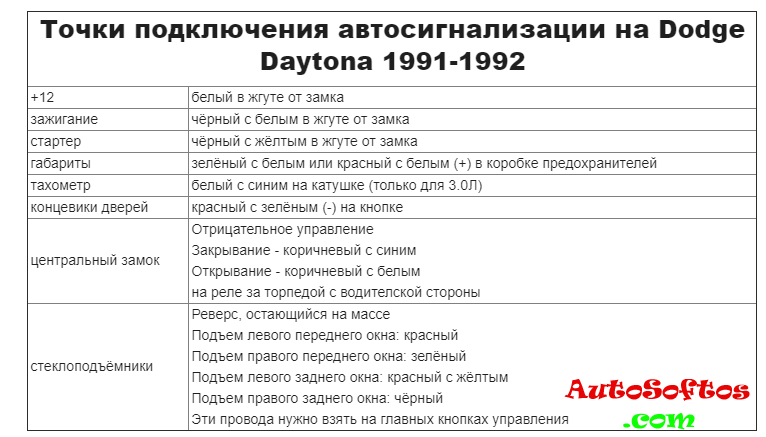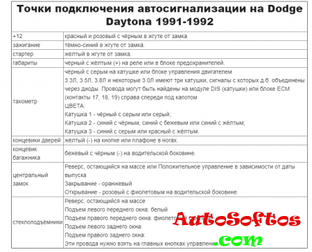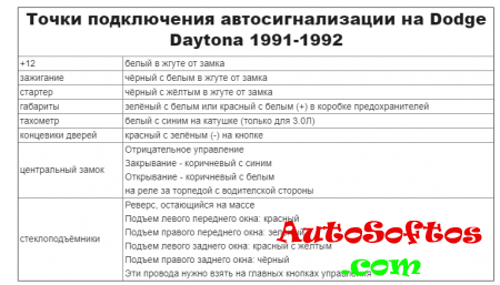 Точки подключения автосигнализации на Dodge Daytona 1991-1992