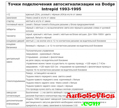 Точки подключения автосигнализации на Dodge Intrepid 1993-1995