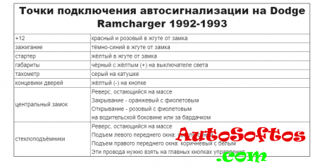 Точки подключения автосигнализации на Dodge Ramcharger 1992-1993