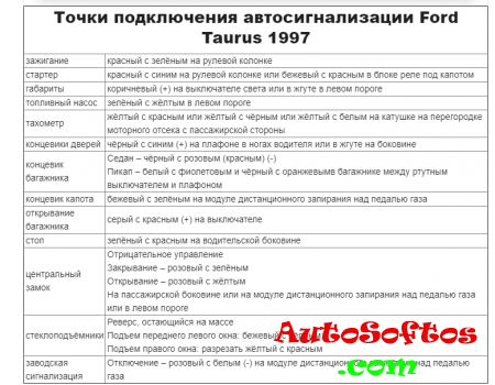 Точки подключения автосигнализации Ford Taurus 1997