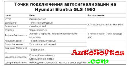Точки подключения автосигнализации на Hyundai Elantra GLS 1993