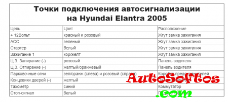 Точки подключения автосигнализации на Hyundai Elantra 2005