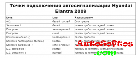 Точки подключения автосигнализации Hyundai Elantra 2009