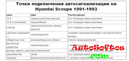 Точки подключения автосигнализации на Hyundai Scoupe 1991-1993