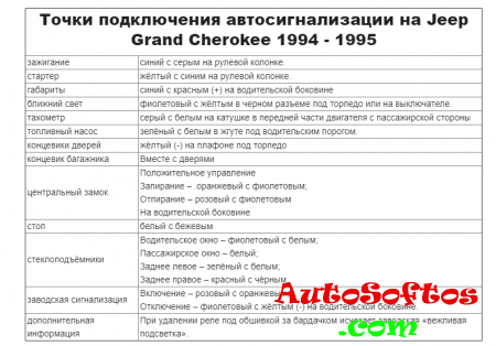 Точки подключения автосигнализации на Jeep Grand Cherokee 1994 - 1995
