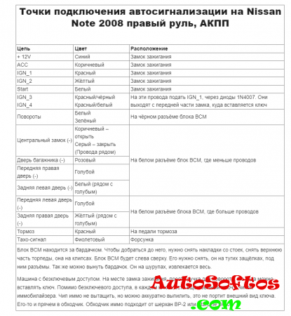 Точки подключения автосигнализации на Nissan Note 2007, правый руль