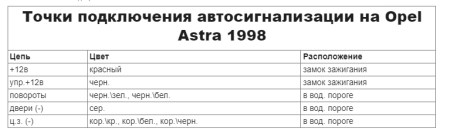 Точки подключения автосигнализации на Opel Astra 1998