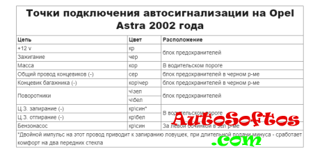 Точки подключения автосигнализации на Opel Astra 2002 года