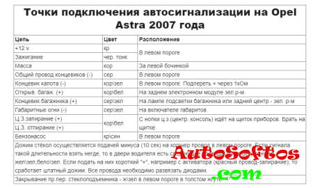 Точки подключения автосигнализации на Opel Astra 2007 года