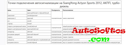 Точки подключения автосигнализации на SsangYong Actyon Sports 2012, АКПП, турбодизель