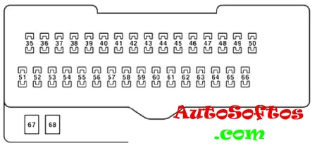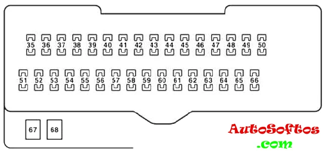 Предохранители 68 на 30А POWER – Стеклоподъемники и 67 на 30А P/SEAT – Сиденья с электроприводом расположены отдельно в верней части блока.