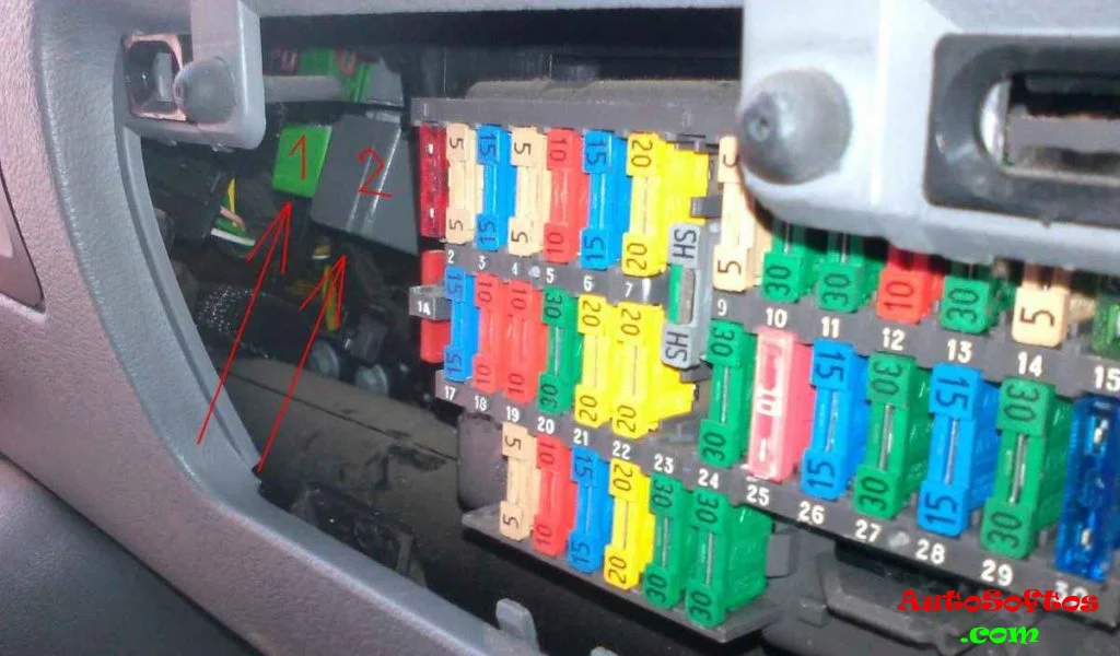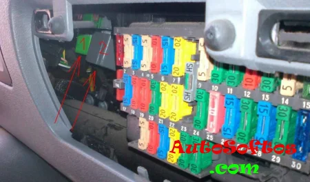 Он находится в напели приборов, за защитной крышкой. Сбоку и снизу могут быть расположены некоторые элементы реле (на рисунке 1 и 2).