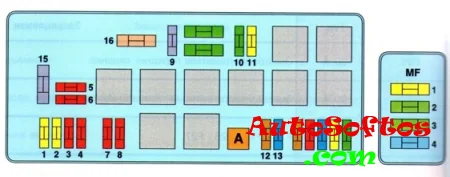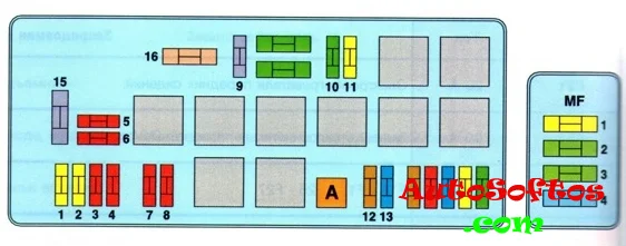 MF1 20A — Реле системы впрыска, MF2 30A — Реле системы впрыска, MF3 30A — Вентилятор салона, MF4 40А — Компьютер ABS.