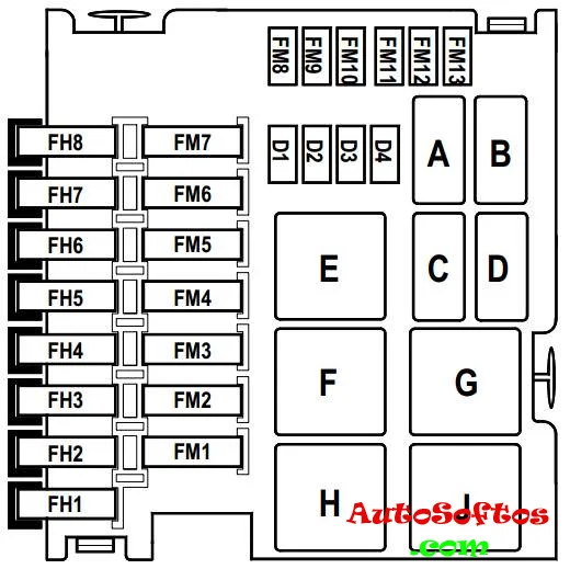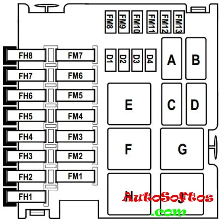 FH3 — 40А ЭБУ АБС/ системы стабилизации траектории - FH4 — 80А Блок предохранителей и реле в салоне