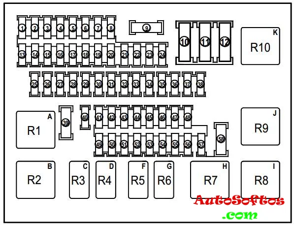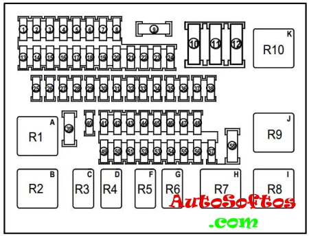 | R1. | Реле питания предохранителей с временной задержкой отключения F39, F40, F41, F42, F43, F44, F49, F50, F51, F52 |