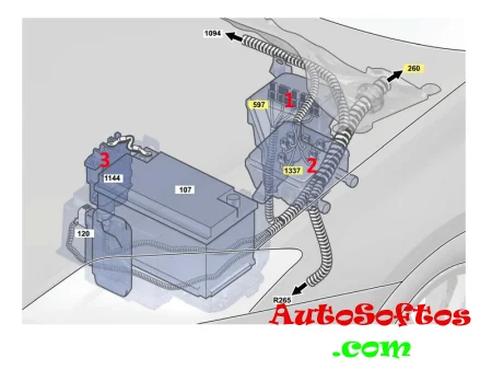 - Многофункциональный блок управления 2- объединен с блоком предохранителей/ реле 1 в моторном отсеке — функции: Кондиционер, электродвигатель вентилятора системы охлаждения, датчик уровня моторного масла, противотуманные фары, топливный насос, фары, омыватели фар, фонари заднего хода, передние габариты, задние габариты, очистители лобового стекла