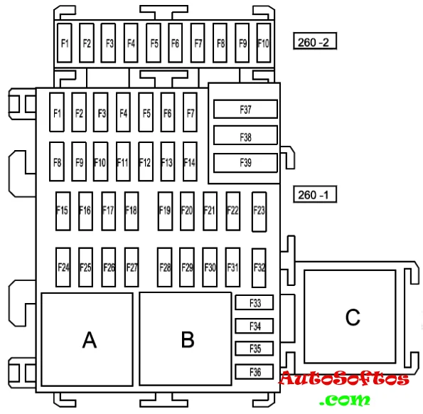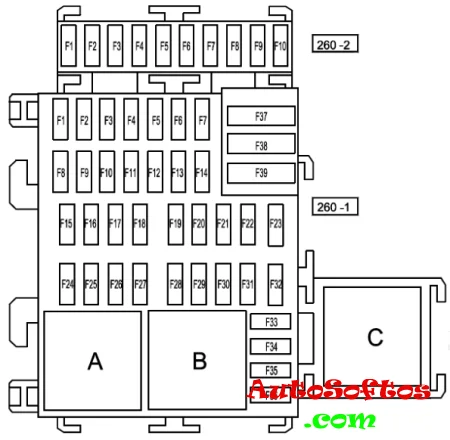 | F5. | 70А Цепи питания предохранителей (F11-F23-F24-F25-F26-F27-F34-F39) в салоне |