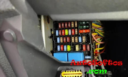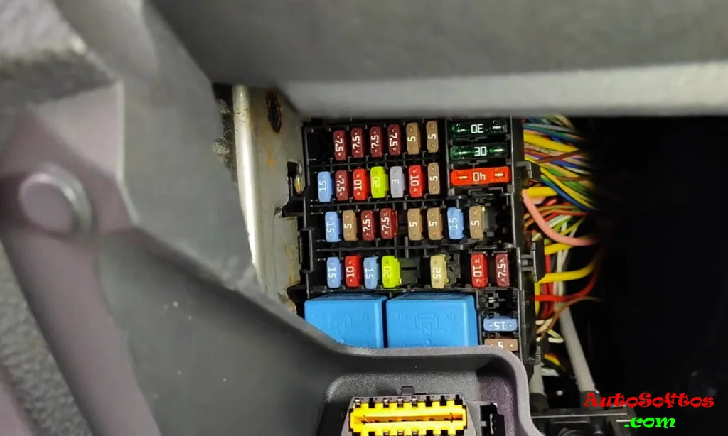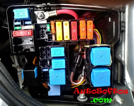 В салоне блок предохранителей и реле находится под панелью приборов, за защитной крышкой.