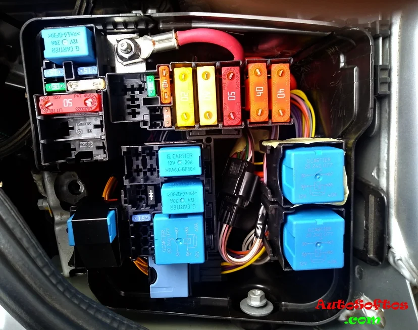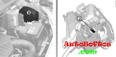 В моторном отсеке блок с предохранителями и реле находится рядом с аккумулятором и закрыт защитной крышкой.